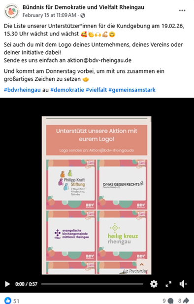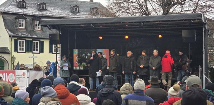 Der Verein Bündnis für Demokratie und Vielfalt Rheingau e.V. hat für Sonntag den 16. Februar 2026 zu einer Demo im Kern Geisenheims aufgerufen. Da witterungsbedingt wenig bis kaum Besucher zu verzeichnen waren, genehmigte die Stadt noch eine Kundgebung für den 19. Februar. Grund war die „Bedrohung der Demokratie und die der Vielfalt“ welche durch den Besuch der AfD Bundestagsabgeordneten Beatrix von Storch ausgelöst wurde. Diese Angst schlug hart nicht nur in den parteilosen -fast neutralen- Bürgermeister, sondern auch in die Parteien die den o.g. Verein stützen ein, nämlich die SPD, die Linke und die B90/Grünen, sogar die CDU aus Lorch. Der Verein hat natürlich Werte und Prinzipien die in der Satzung festgehalten sind, darum kommen nicht alle Parteien als Unterstützer in Frage (s. Liste der Unterstützer unten, und Kommentar des Vereins zu den unterstützenden Parteien). Im Leitbild der Satzung wird Toleranz und Vielfalt betont, jedoch wird die Toleranz gegenüber politischer Meinungsvielfältigkeit durch Verschweigen ganz ausgeklammert. Drum heißt es in der Satzung: Wir sind überzeugt, dass die Achtung der Menschenrechte, die Gleichberechtigung aller Menschen, unabhängig von Geschlecht, Herkunft, Religion, Weltanschauung, Behinderung oder sexueller Orientierung, sowie die Anerkennung und Wertschätzung kultureller, ethnischer und sozialer Vielfalt die Grundlagen einer freien und gerechten Gesellschaft bilden.[1] So sind nur die „linksorientierten Parteien“ als Förderer akzeptiert, und die parteilosen Bürgermeister gerne unter dieser nichtvielsagenden Doktrin der Toleranz und Vielfalt eingespannt. Darum sind die Herren Amtsträger Nikolaos Stavridis (parteilos, Walluf), Carsten Sinß (SPD, Oestrich-Winkel), Oliver Lübeck (CDU, Lorch), Dirk Stuckert (parteilos, Rüdesheim) sowie der Erste Beigeordnete Rüdiger Wolf (SPD) aus Kiedrich auf der Bühne hinter Herrn Aßmann aufgereiht. Sie setzen wohl „ein Zeichen“ – was immer das für sie heißen mag:[2]